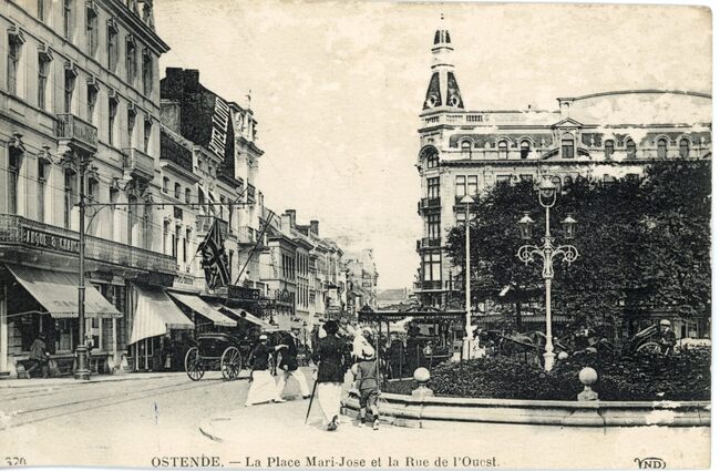 Neurdein/ND Phot. 320. - Ostende - La Place Mari[e]-José et la Rue de l'Ouest. Het Marie-Joséplein en rechtdoor de Weststraat, nu Adolf Buylstraat. Rechts, het Boucherygebouw. Let ook op de sierlijke…