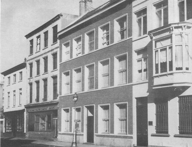 Formaat : 7 x 10 cm. - De Groentemarkt. Rechtdoor, de Kaaistraat. Links op de hoek, de porceleinenwinkel van L. Breemersch