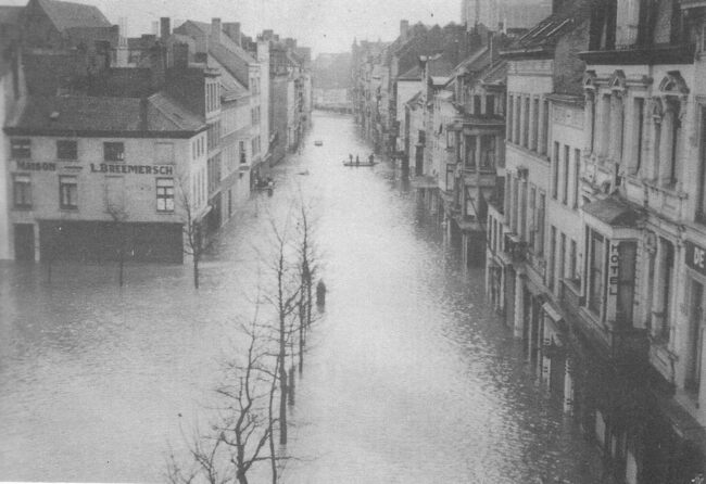 Groentenmarkt en de Kaaistraat met links op de hoek de porseleinwinkel van L. Breemersch. In de achtergrond de kerktorens van de Sint-Petrus- en –Pauluskerk. AFMETINGEN INTERN : 28 x 40,5 cm AFMETINGEN…