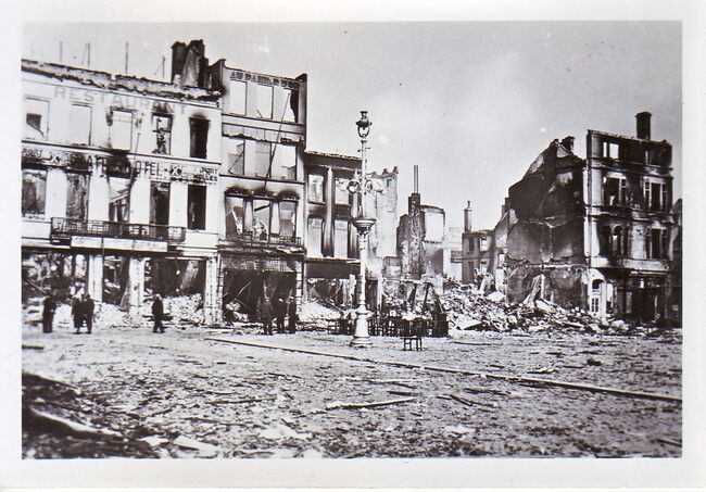 Foto : 9,5 x 6.5 cm. - Het Wapenplein na de bombardementen van mei 1940. Gedeelte tussen de Brabant- en Breydelstraat. Rechts de Kerkstraat. Foto : (kopie van postkaart). Het Wapenplein in het Interbellum. (met dank aan…