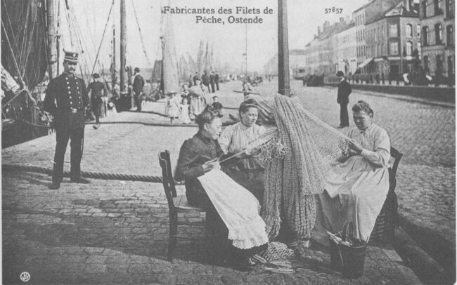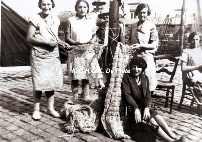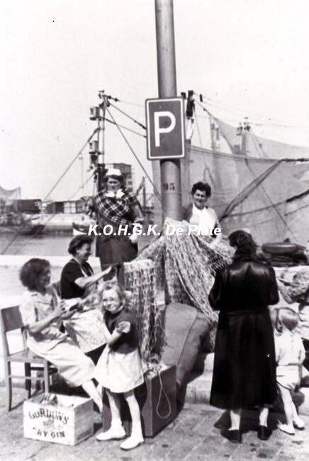 formaat : 13 x 18 cm. - Vissersvrouwen breien nette (korren) langs de Visserskaai. Op de achtergrond het Montgomerydok.