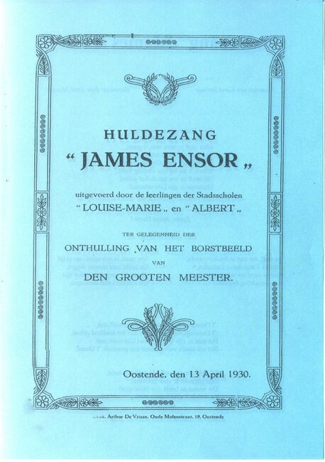 Uitgevoerd door de leerlingen der Stadsscholen "Louise-Marie" en "Albert" ter gelegenheid der onthulling van het borstbeeld van den grooten meester. Oostende, den 13 april 1930.
