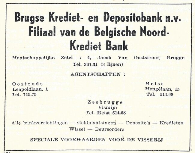 Advertentie : Brugse Krediet- en Depositobank nv. Filiaal van de Belgische Noord-Krediet Bank. Leopoldlaan 1, Oostende