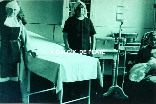 Afdruk. Formaat : 13 x 18,5 cm. Links Sylvère Vansteelandt. In het midden zuster Martha met patiënten en bewoners van het rusthuis. Achter de muur is de Kaïrostraat te zien. Het gedeelte tussen de Jules Peurquaetstraat en…
