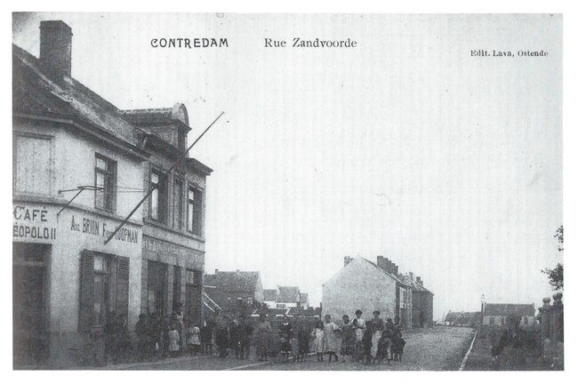 Contredam. Rue Zandvoorde. Edit. Lava, Ostende. Het "Café Léopold II", gelegen op de hoek van de Zandvoordestraat en de huidige Rokerijstraat. Uitbater : Auguste Brion en dochter Julie…