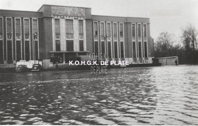 Een muziekgroep uit Gent (?), met vaandels, uit de carnavalstoet op de trap van het dd. stadhuis (huidig gerechtshof) aan het Canadaplein. De grote halfvastenstoet van 16 maart 1947 bestond uit 40 groepen, 15 praalwagens…