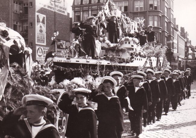 Vergroting. - Formaat : 30 x 42 cm. - Leerlingen van het Koninklijk Werk IBIS rond de praalwagen "Car-Ferry" van het Zeewezen in de bloemencorso van 1950 op het Wapenplein.