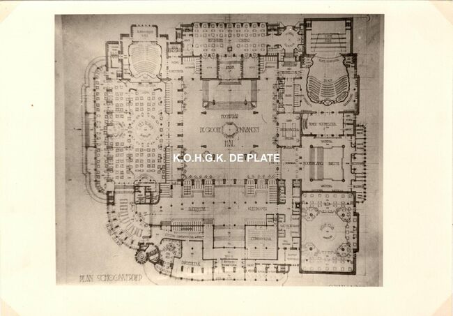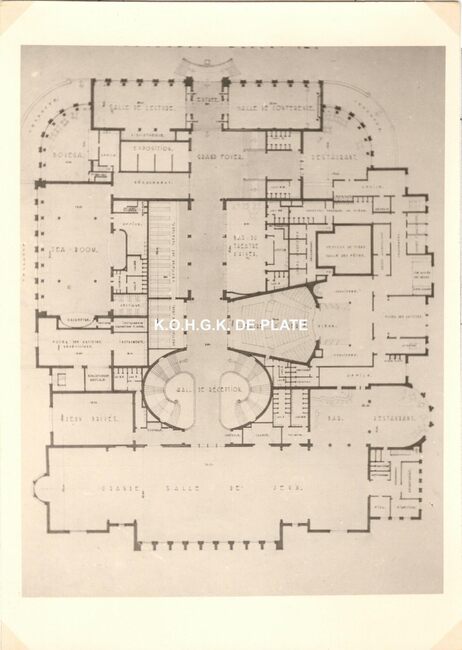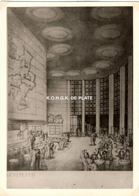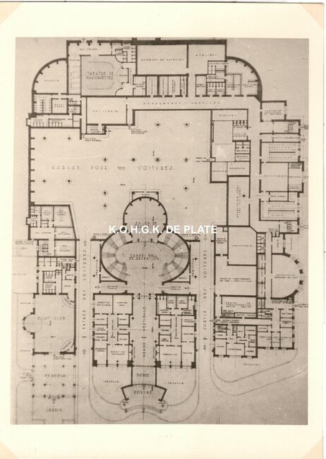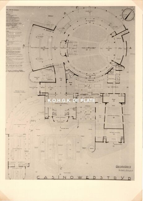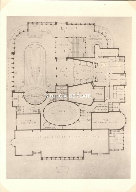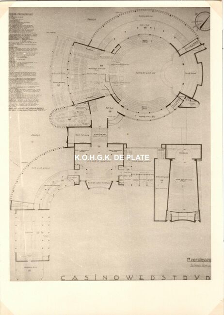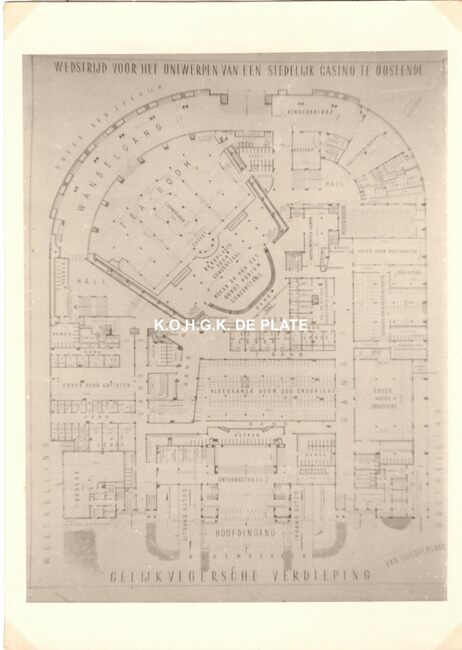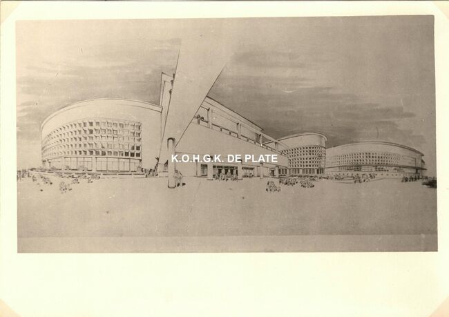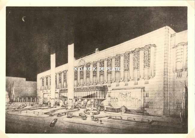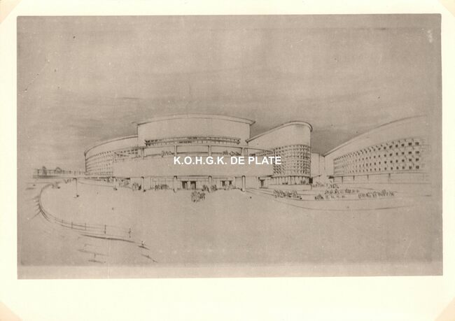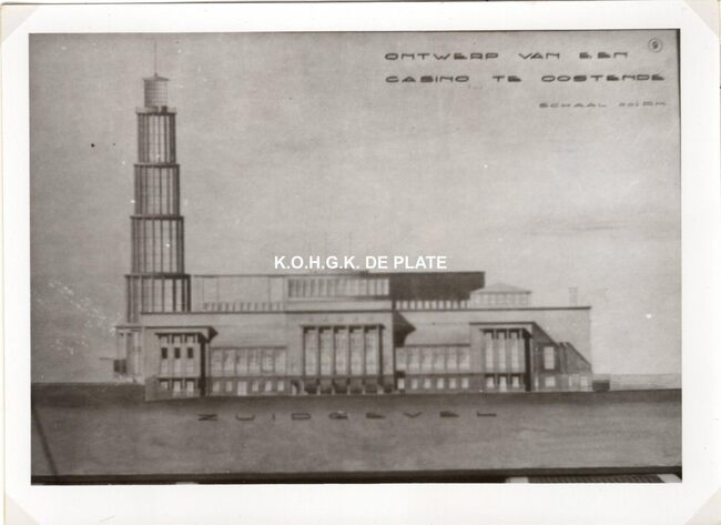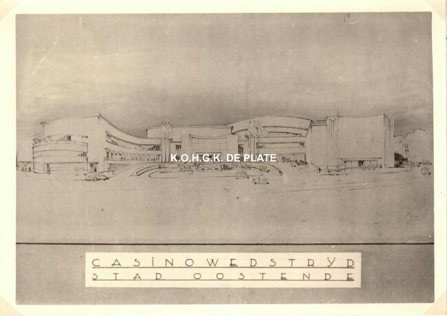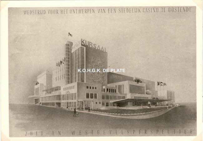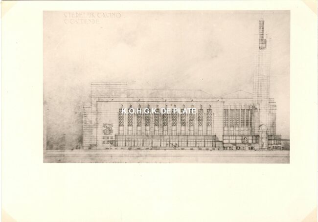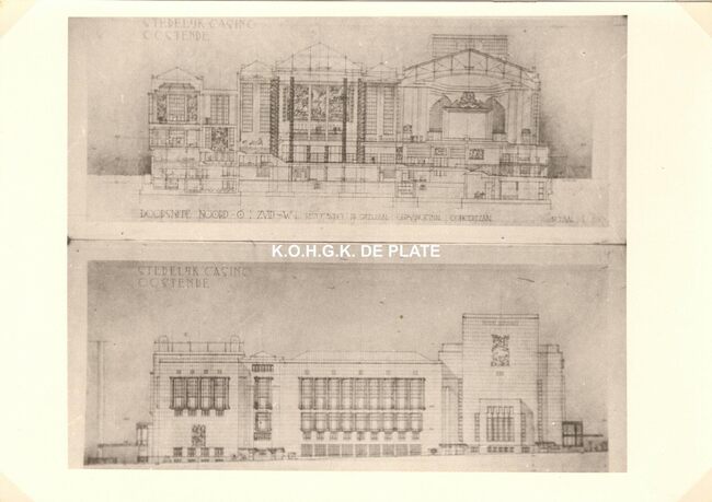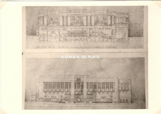 Formaat : 13 x 18 cm. - Wedstrijd voor het ontwerpen van een stedelijk casino te Oostende. Zuid- en westgevelsperspectief. 2 exemplaren