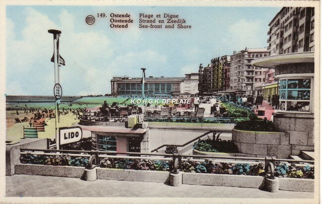 Postkaart Albert , N° 109. - Oostende - Vue générale. Plage et Kursaal. Oostende - Algemeen zicht. Strand en Kursaal. Ostend - General view. Sands and Kursaal. - De "Lido" op het Groot Strand. Op de achtergrond…