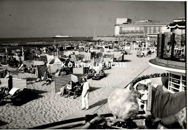 Formaat : 18 x 24 cm. - Het groot dtrand, vanaf de badinstallaties onder de Albert I-Promenade. We zien links, het Lido en op het einde de westgevel van het vierde Kursaal.