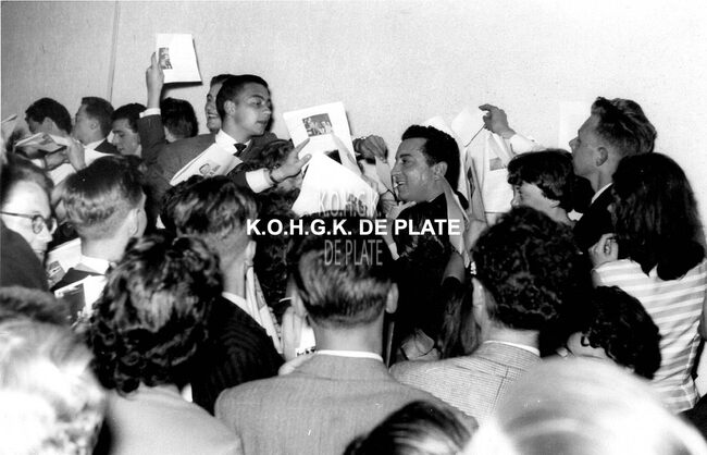 Formaat : 13 x 18 cm. - Johnnie Ray trad op met het kursaalorkest van Franz Lebrun. We zien hem hier rechts aan de piano. Links, aan de piano, Franz André en onze stadsgenoot Roger Vanhaverbeke, contrabas. Dirigent, Franz…