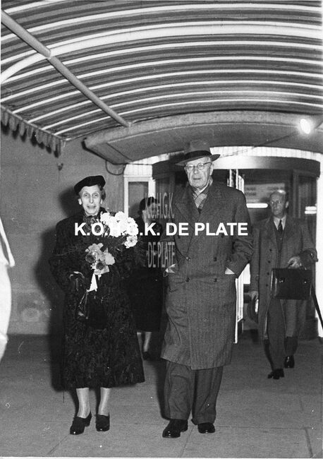 2 exemplaren, formaten : 28 x 24 cm. en 13 x 18 cm. - Het Zweeds vorstenpaar bij het verlaten van het Kursaal waar zij dineerden. Zij waren op doorreis van Engeland naar Zweden. Een piccolo is van dienst.