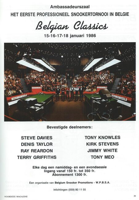 ADVERTENTIES ; CASINO-KURSAALADVERTENTIES ; SPORTCASINO-KURSAAL ; EVENEMENTENSPORT ; SNOOKERDAVIES STEVE (SNOOKERSPELER)TAYLOR DENIS (SNOOKERSPELER)REARDON RAY (SNOOKERSPELER)GRIFFITHS TERRY (SNOOKERSPELER)KNOWLES TONY (SNOOKERSPELER)STEVENS KIRK (SNOOKERSPELER)WHITE JIMMY (SNOOKERSPELER)MEO TONY (SNOOKERSPELER)