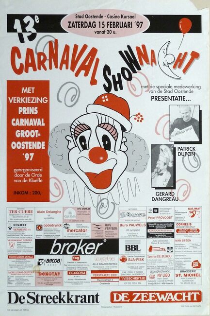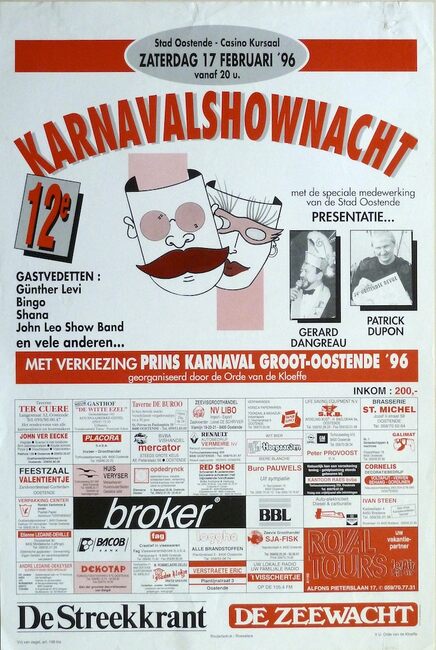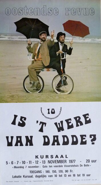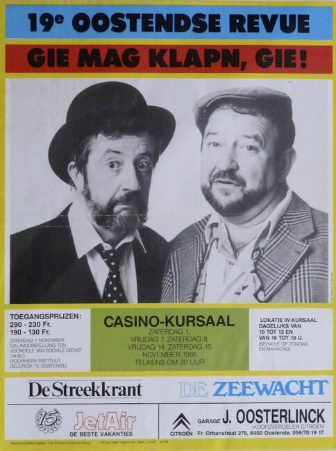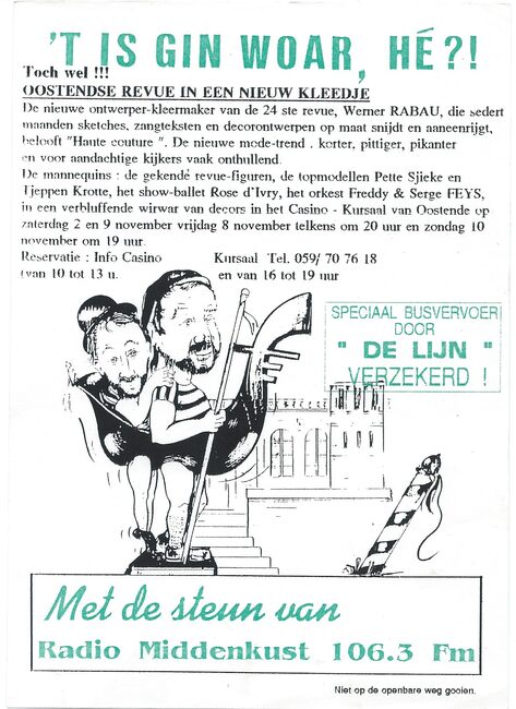 DANGREAU GERARD (1930-2006) (PETTE SJIEKE) (OOSTENDSE REVUE)FEYS FREDDY (MUZIKANT)(OOSTENDSE REVUE)MOERMAN HERMAN (1930-2013) (JOURNALIST) (TJEPPEN KROTTE)FEYS SERGE (MUZIKANT)'T IS GIN WOAR HE (REVUE)RABAU WERNER (AUTEUR TONEELREGISSEUR) (OOSTENDSE REVUE)CASINO-KURSAAL ; EVENEMENTENOOSTENDSE REVUE (NAAM)KLEIN DRUKWERKKONINKLIJKE BALLETSCHOOL ROSE D'IVRY