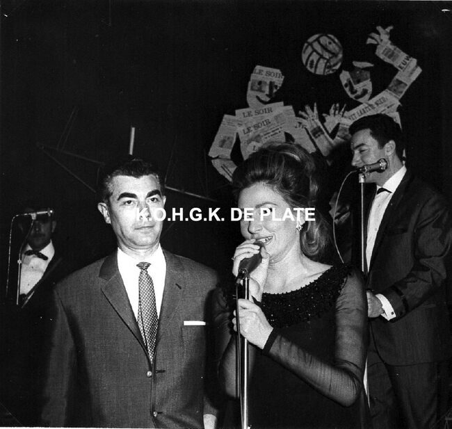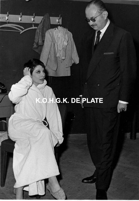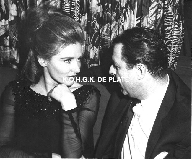Formaat : 17 x 12 cm. - Zizi Jeanmaire in het gezelschap van Roger De Ramée, directeur van de Kursaal, na haar optreden in het auditorium met haar show "Mon Truc en Plumes".