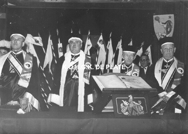 Formaat : 18 x 24 cm. - Kolonel Charles Laurent in het gezelschap van links naar rechts : Emilien Michiels, directeur van de Kursaal, John Lauwereins, schepen en Pierre van Outryve d'Ydewalle, gouverneur van de…