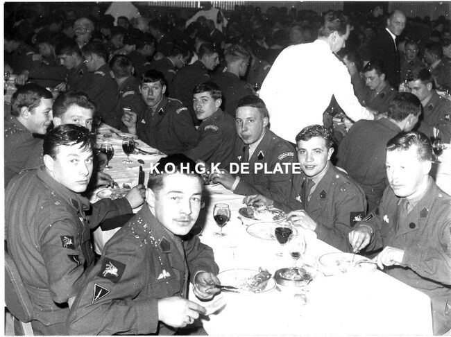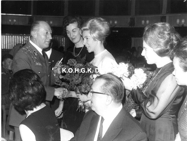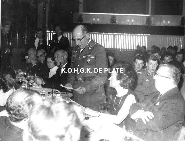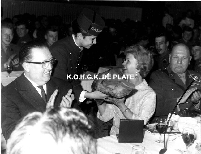Formaat : 13 x 18 cm. - De lunch. Mevrouw De Ramée en rechts naast haar, premier Théo Lefèvre. Burgemeester Jan Piers is ook van dienst.