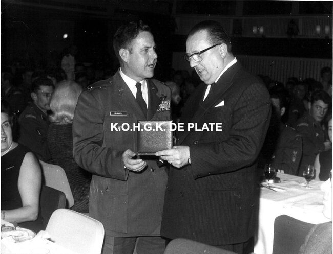 Formaat : 18 x 24 cm. - Kolonel Burgess Gradwell krijgt de ere-medaille van de Stad Oostendse aangeboden door schepen John Lauwereins. Kolonel Burgess Gradwell leidde het luchttransport van de Belgische troepen. Hij…