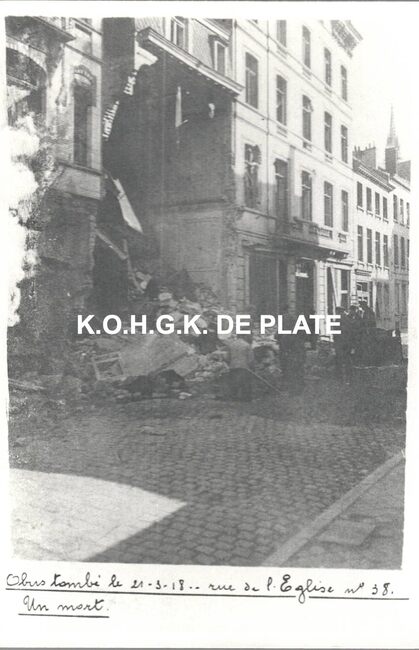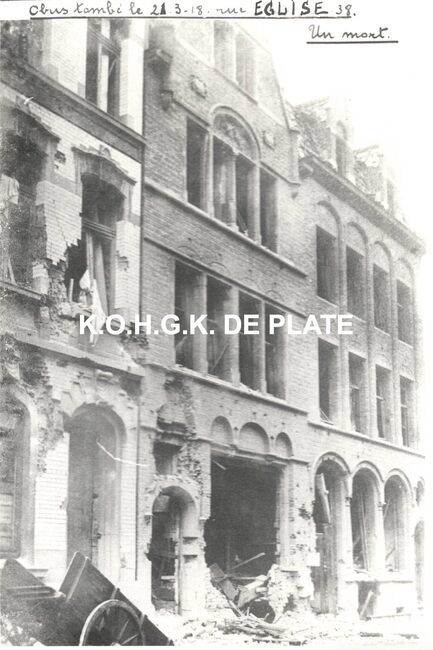 Formaat : 12,5 x 8 cm. - Obus tombé le 21-3-18 rue Eglise 38. Un mort. - Er viel in woning nr.38 één oorlogsslachtoffer : Clement Léontine Marie, echtgenote van Vercoullie Bernard.