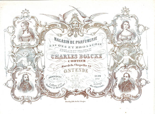 Formaat : 10,5 x 14,2 mm. - Magasin de parfumerie, Savons et Brosserie, Anglais et Français, Charles Bolcke Coiffeur, Rue de la Chapelle N°49 Ostende. Abonnement de la coiffures pour Dames et Messieurs. Salon pour la…