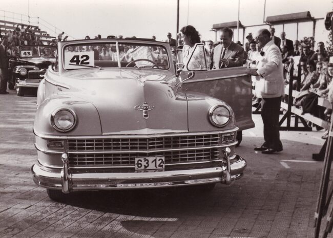 Formaat : 13 x 18 cm. - Wedstijd voor auto's op de Albert I-Promenade aan het nog niet herbouwde Kursaal. Burgemeester Hendrik Serruys feliciteert een winnaar.