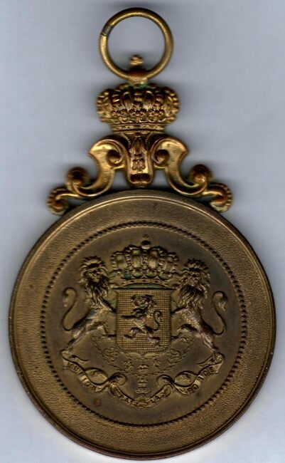 Op de voorzijde : rondom een keten, centraal wordt een zwaard afgebeeld met links een lauriertak, hiernaast…
