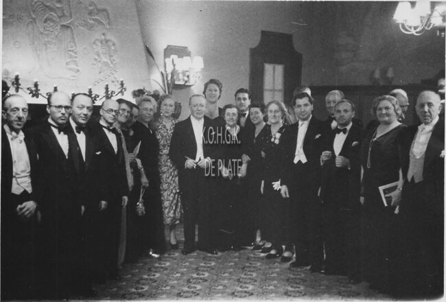 Formaat : 13 x 18 cm. - De receptie in de Koninklijke Schouwburg op 13 augustus 1949 in het kader van 100 jaar Conservatorium. Van links naar rechts : Julien Gadeyne, Lucien Van Branteghem, Maurice Van Branteghem, Lievin…