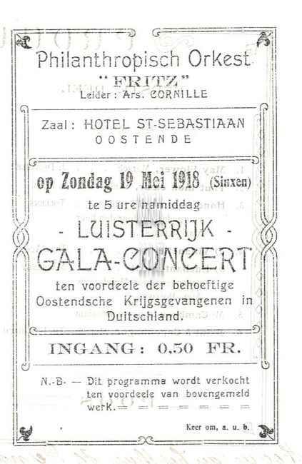 op zondag 19 mei 1918 (Pinksteren) in hotel St.-Sebastiaan ten voordele van de behoeftige Oostendse krijgsgevangenen in Duitsland