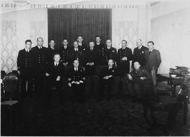 Commandant Couteaux, directeur zeevaartschool Oostende, tweede van links, aan boord van een pakketboot.