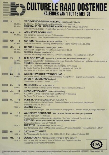 Formaat : 42 x 30 cm. - 03/10 : Geleid bezoek tentoonstelling "Felicien Rops". Volkshogeschool afd. Oostende ; Geleid bezoek Vlaams Parlement. Wijkcentrum 't Kasteel Zandvoorde ; 03 en 04/10 : Fototentoonstelling "…