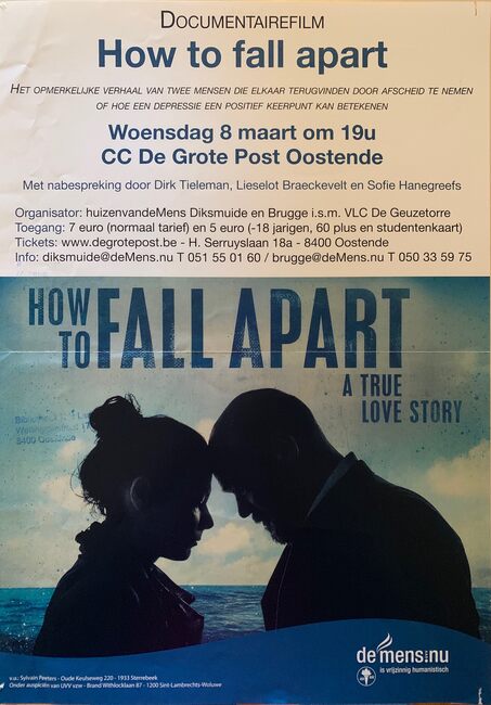 Affiche : huizenvandeMens Diksmuide en Brugge i.s.m. VLC De Geuzetorre. How to fall apart : documentatiefilm. CC De Grote Post Oostende. 08/03/[2017]