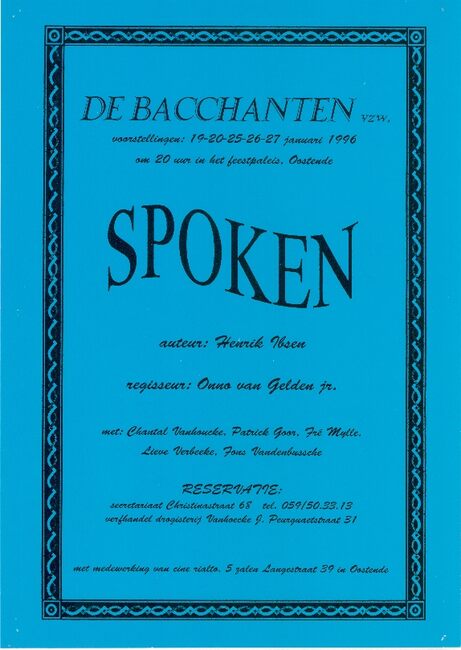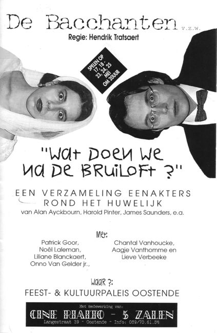 PROGRAMMA'SDE BACCHANTEN (TONEELVERENIGING)WAT DOEN WE NA DE BRUILOFT (EENAKTERS)TONEELSTUKKENGURNEY JR. AR (AUTEUR)AYCKBOURN ALAN (AUTEUR)SAUNDERS JAMES (1925-2004) (AUTEUR)OWEN ALEX (AUTEUR)BOWEN JOHN (1924-2019) (AUTEUR)PINTER HAROLD (1930-2008) (AUTEUR NOBELPRIJSWINNAAR)CAMPTON DAVID (19124-2006) (AUTEUR)FEEST- EN CULTUURPALEIS ; TONEELTRATSAERT HENDRIK (TONEELREGISSEUR)