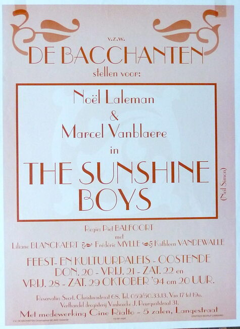 AFFICHESDE BACCHANTEN (TONEELVERENIGING)TONEELSTUKKENFEEST- EN CULTUURPALEIS ; TONEELTHE SUNSHINE BOYS (TONEELSTUK)SIMON NEIL (AUTEUR)LALEMAN NOËL (TONEELSPELER TONEELREGISSEUR)VANBLAERE MARCEL (EERSTE MARCONIST TONEELSPELER)BLANCKAERT LILIANE (TONEELSPEELSTER)MYLLE FREDERIC (TONEELSPELER)VANDEWALLE KATHLEEN (TONEELSPEELSTER)BALFOORT PIET (1933-2013) (ACTEUR TONEELREGISSEUR)