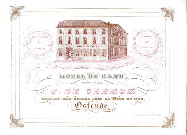 Formaat : 10,5 x 14,4 mm. - Hotel de Gand tenu par B.De Clerck, Marché-aux-herbes prés la Digue de Mer Ostende. Table d'hôte à 1 heure. Remises er Ecuries. Loue des Voitures en Cheveaux. Rood ingekleurd.