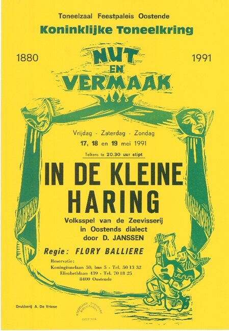 Affiche : Koninklijke toneelkring Nut en Vermaak. In de kleine Haring. Feestpaleis Oostende. vrijdag 17, zaterdag 18 en zondag 19 mei 1991