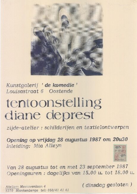 Affiche : Diane Deprest. Zijde-atelier : schilderijen en textielontwerpen. Tentoonstelling. De Komedie. Van 28 augustus t.e.m. 23 september 1987