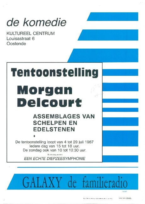 Affiche : Morgan Delcourt. Assemblages van schelpen en edelstenen. Tentoonstelling. De Komedie. Van 4 tot 29 juli 1987