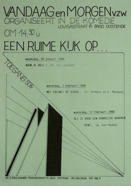 Affiche : Vandaag en Morgen. Een ruime kijk op... De Komedie. 20/01, 3/02 en 17/02/1988