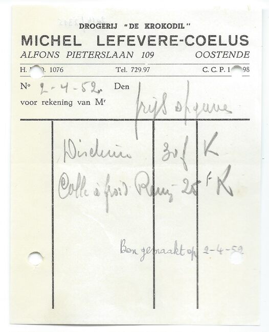 Rekening : Michel Lefevere-Coelus. Drogerij "De Krokodil". Alfons Pieterslaan 109, Oostende