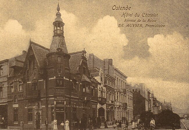 Ostende. Hôtel du Chatelet. Avenue de la Reine. De Muyser, propriétaire."Hôtel du Chatelet", later afgekort tot "Le Chatelet". Hoekpand gelegen aan het kruispunt Petit Paris, Nieuwpoortsesteenweg 8,…