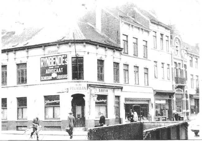 Mannen van de stedelijke reinigingsdienst ruimen sneeuw in de Alfons Pieterslaan. De straathoek achter de vrachtwagen links is deze met de Jules Puerquaetstraat, met zicht op café In de Pelikaan.