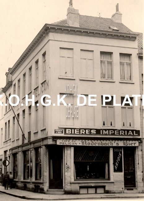 Formaat : 12 x 8,5 cm. Gelegen op de hoek met de Wittenonnenstraat (links). Nu, 2017, "Pelican Inn". Luifelopschrift : Café du Pelican. Rodenbach's Bier. Gevelopschrift Wittenonnenstraat : Hotel Café du…