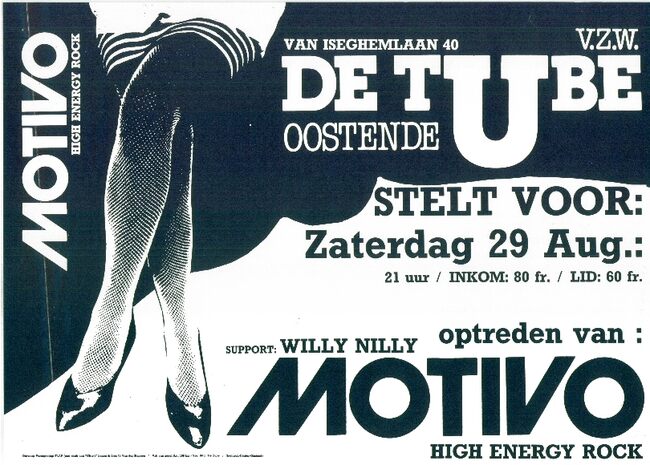 Affiche : De Tube v.z.w. Motivo high energy rock. Oostende: Van Iseghemlaan 40. Zaterdag 29 Augustus.... (?)