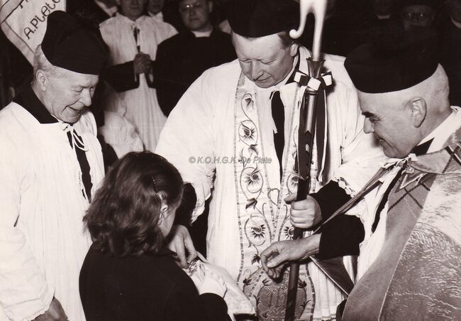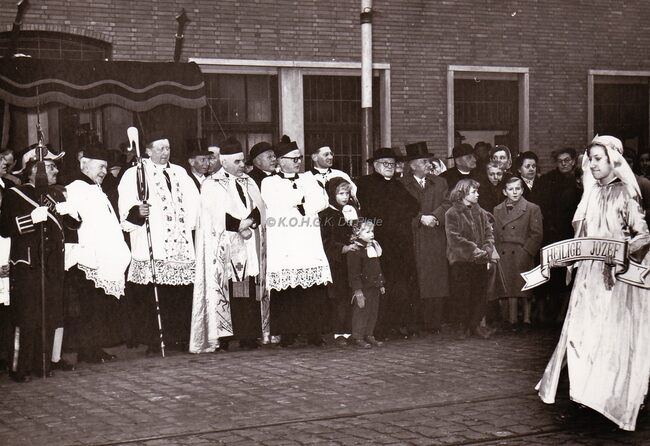 Joseph DE VISCHERE, de nieuwe pastoor van de Sint Jozefskerk (met staf). Hij was pastoor van de Sint-Jozefsparochie vanaf 31 december 1954. Met rust op 20 oktober 1969.