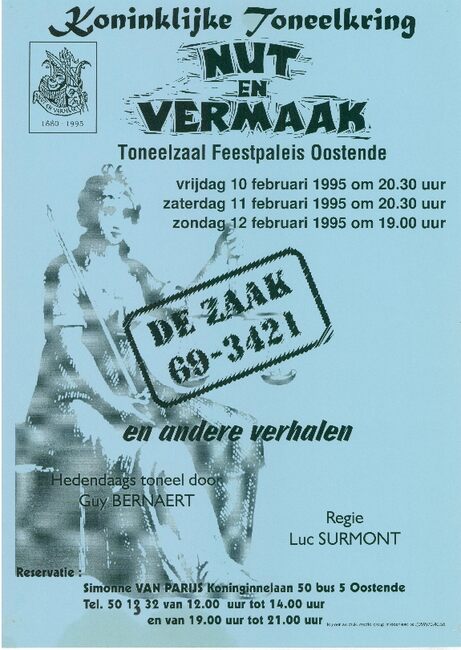 Affiche : Koninklijke toneelkring Nut en Vermaak Oostende. De zaak 69-3421. Feestpaleis Oostende. 10,11,12 februari 1995.