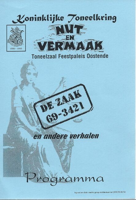 Programma : Koninklijke toneelkring Nut en Vermaak. Drie eenakters : De zaak 69-3421. Twintig minuten te lang. De eerste na vijfentwintig jaar. Feestpaleis Oostende. 10-12/02/1995