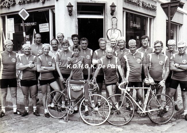 Foto : 17.5 x 12.5 cm. - Voor hun lokaal. - "Café Maes, bij Maurice Maes, Nieuwpoortsesteenweg 290. Voor 1993. De man op de tweede rij, niet in wielerkledij is Maurice Maes" (Redgy Hermant)