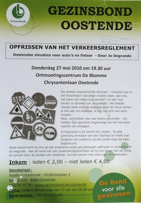 Affiche : Gezinsbond Oostende. Opfrissen van het verkeersreglement. Ontmoetingscentrum De Blomme. 27 mei 2010.