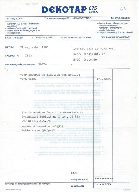Factuur : Dekotap. Vloer-, raam- en muurbekleding. Torhoutsesteenweg 675, Oostende