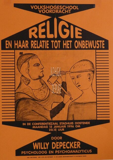 Affiche : Volkshogeschool. Religie en haar relatie tot het onbewuste. Conferentiezaal stadhuis Oostende. 15/01/1996.